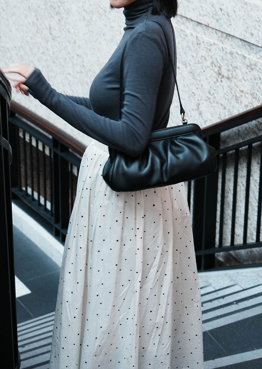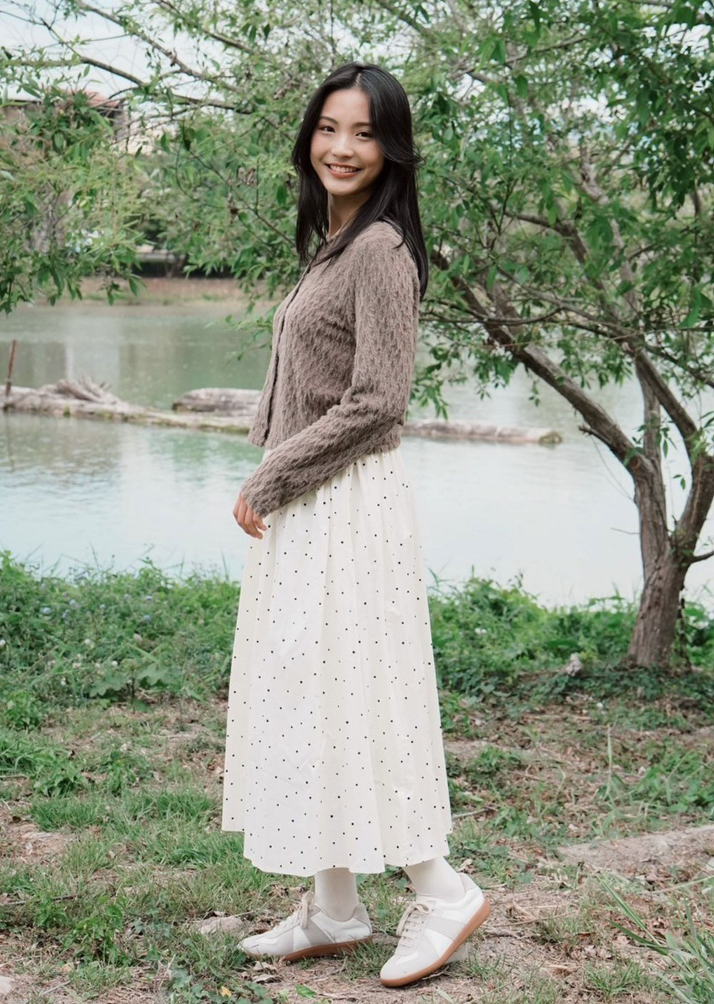 * 首選比鮮色波點更低調時尚的杏色底黑波點半截裙,上身配襯毛衣或衞衣,瞬即減齡,同時顯得舒適隨意。* 配襯高領衣或合身上衣,散發女人味與優雅姿態。