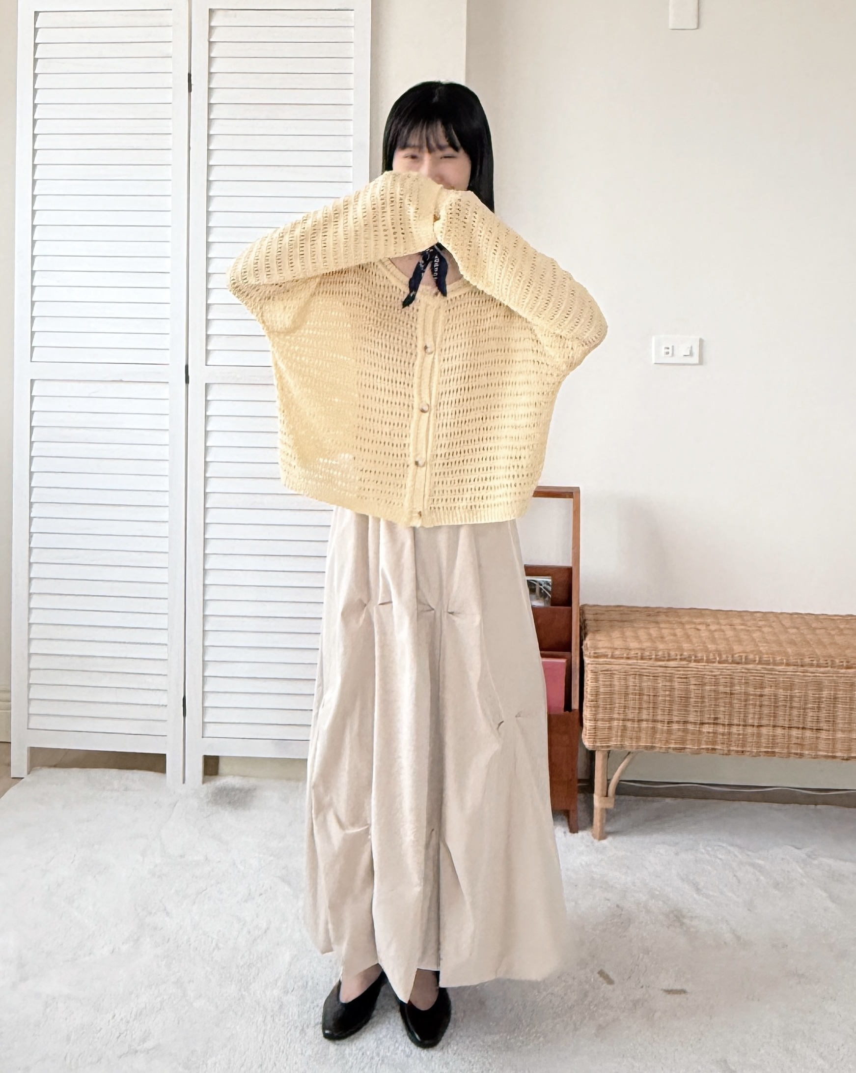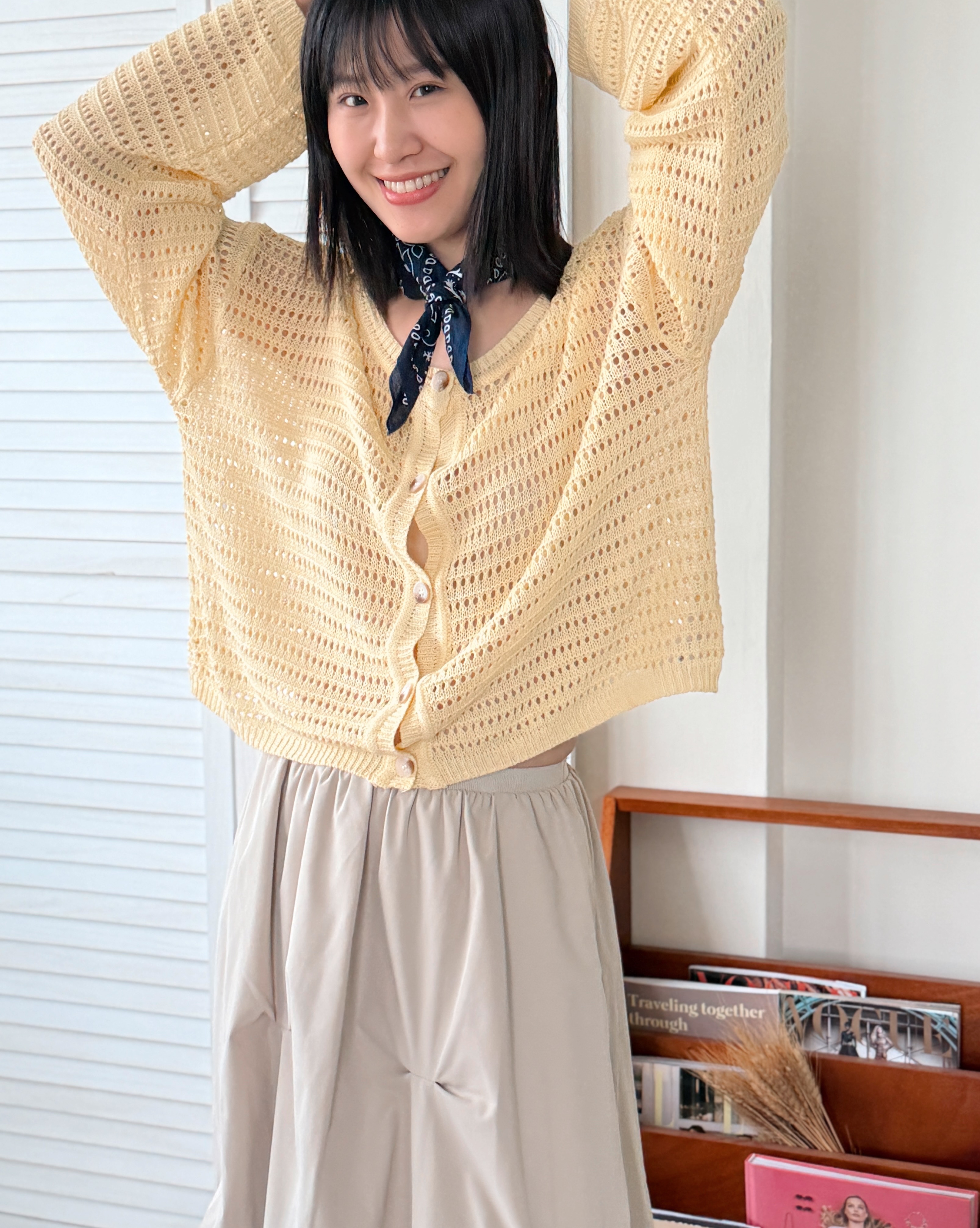 我是Witharch的設計師阿秋。這次推出的法式前後穿扣衫,是一件充滿巧思與實用性的針織上衣。選用100% Acrylic材質,紗線輕薄透氣,讓你在夏天也能感受到清爽與舒適。