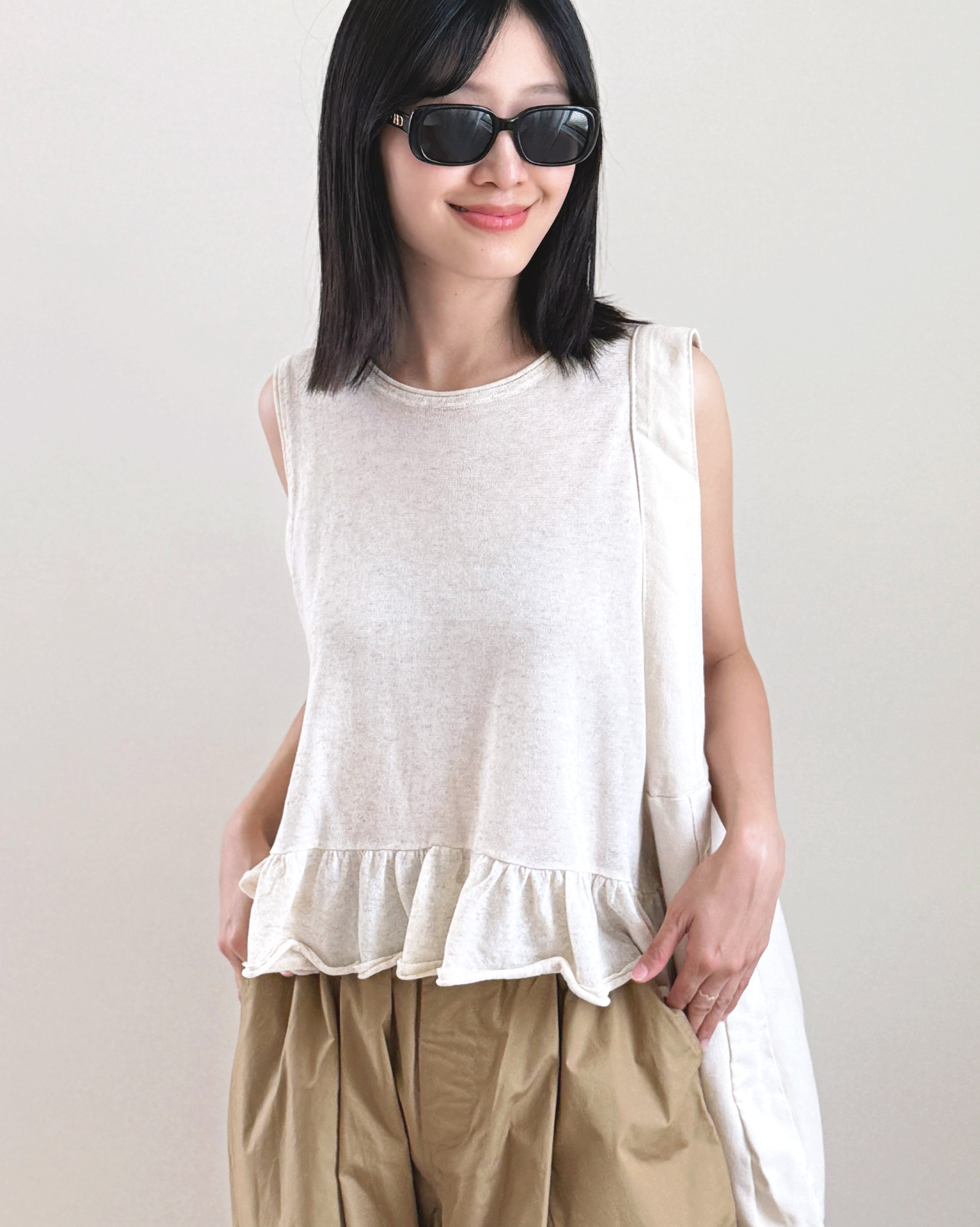 亞麻柔褶傘擺上衣