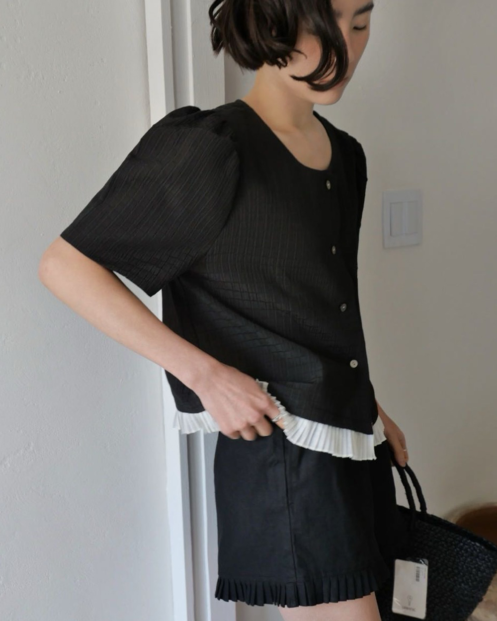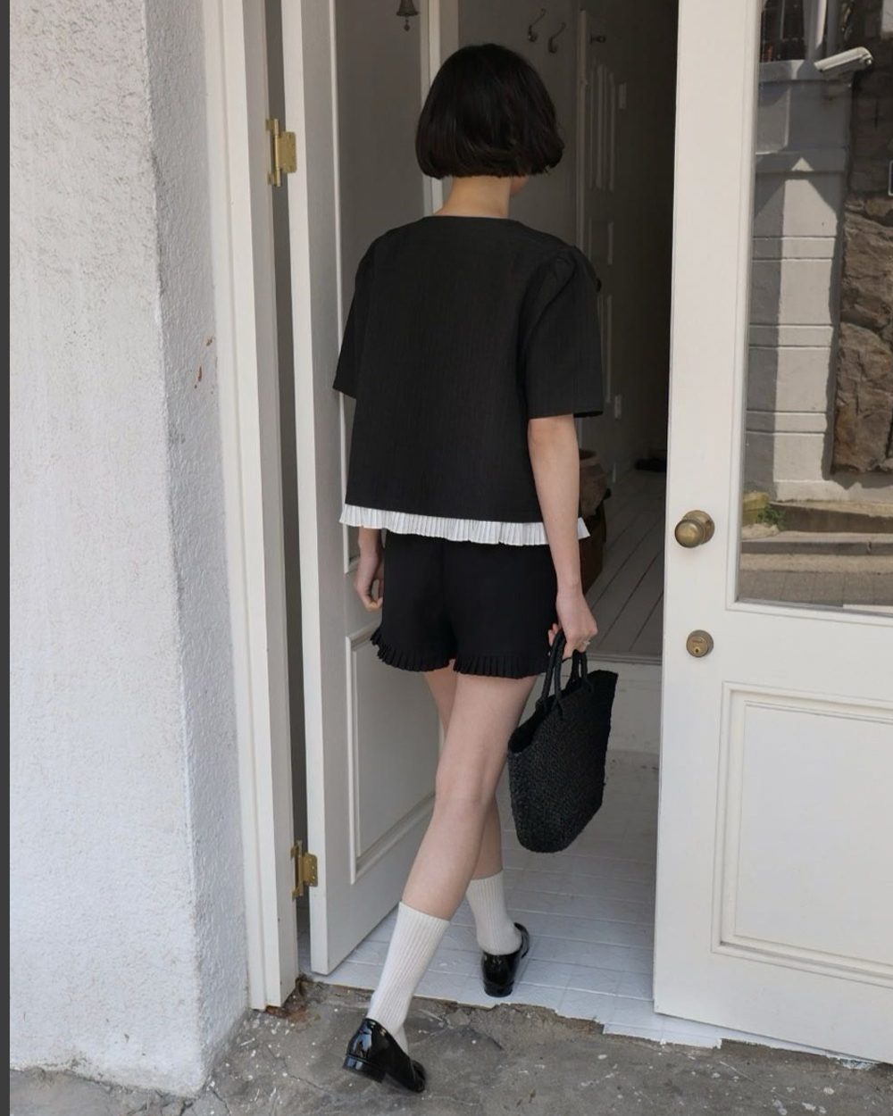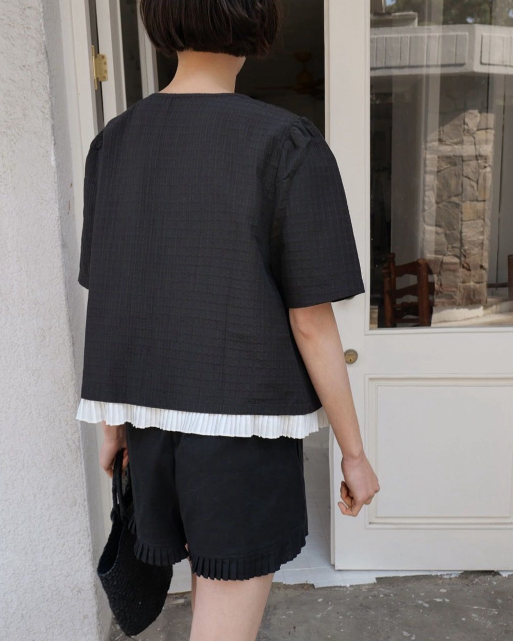 精緻的花苞袖增添了柔美立體感,下擺的撞色百褶巧思更打破純黑單調,穿出豐富的層次品味。
