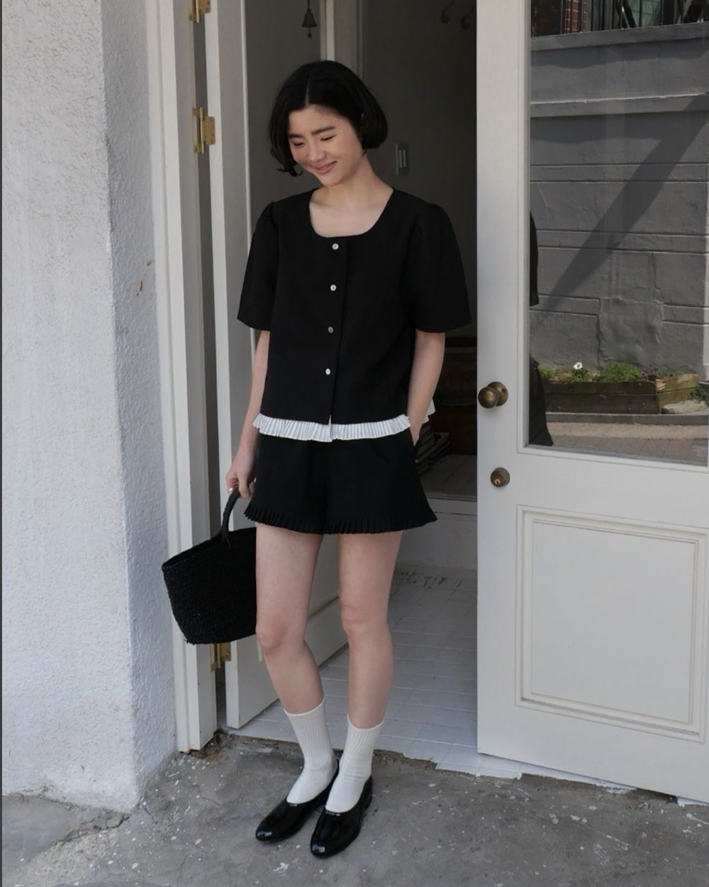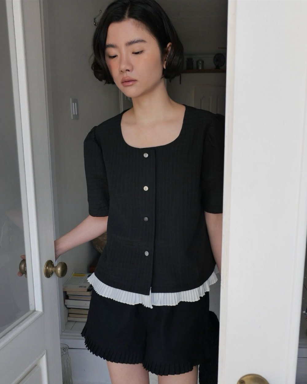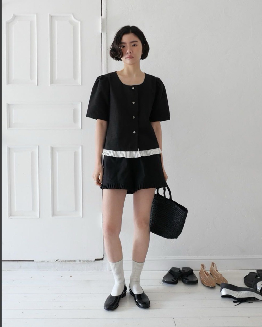 精緻的花苞袖增添了柔美立體感,下擺的撞色百褶巧思更打破純黑單調,穿出豐富的層次品味。