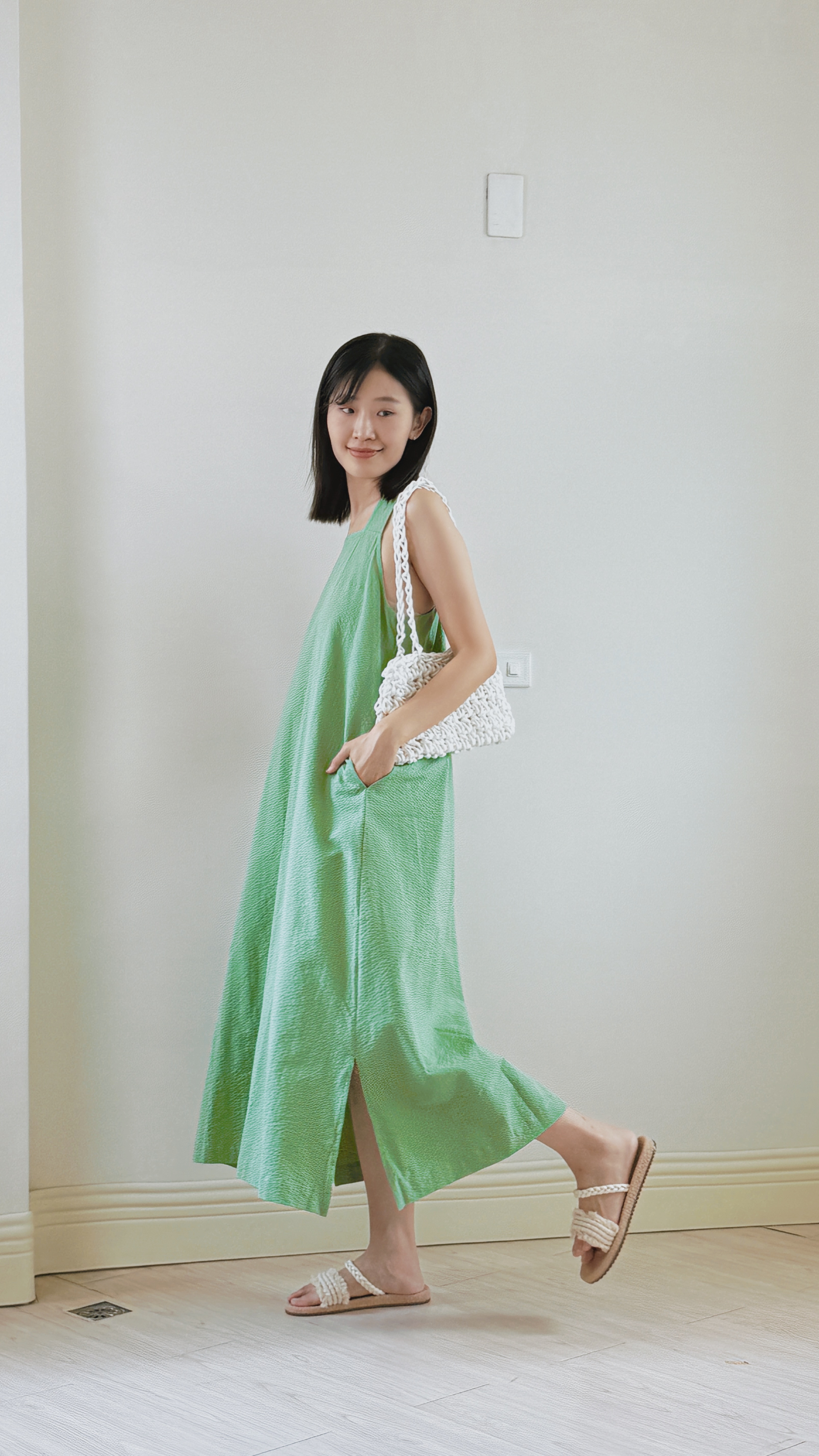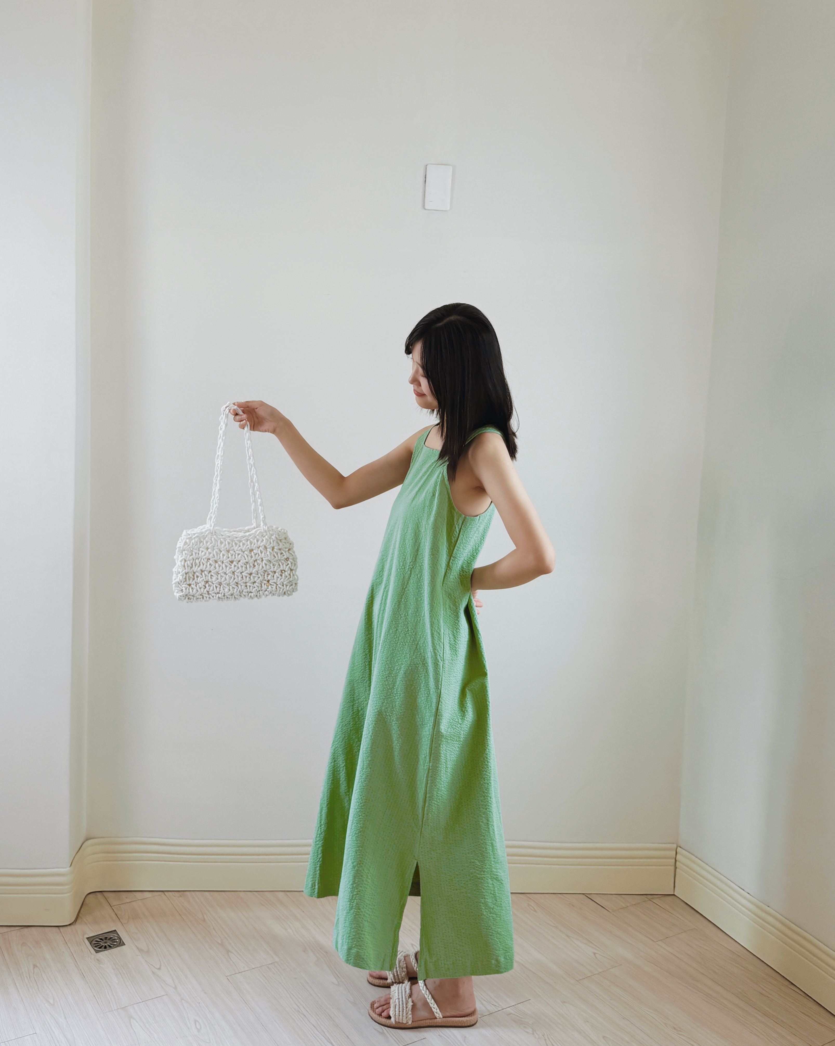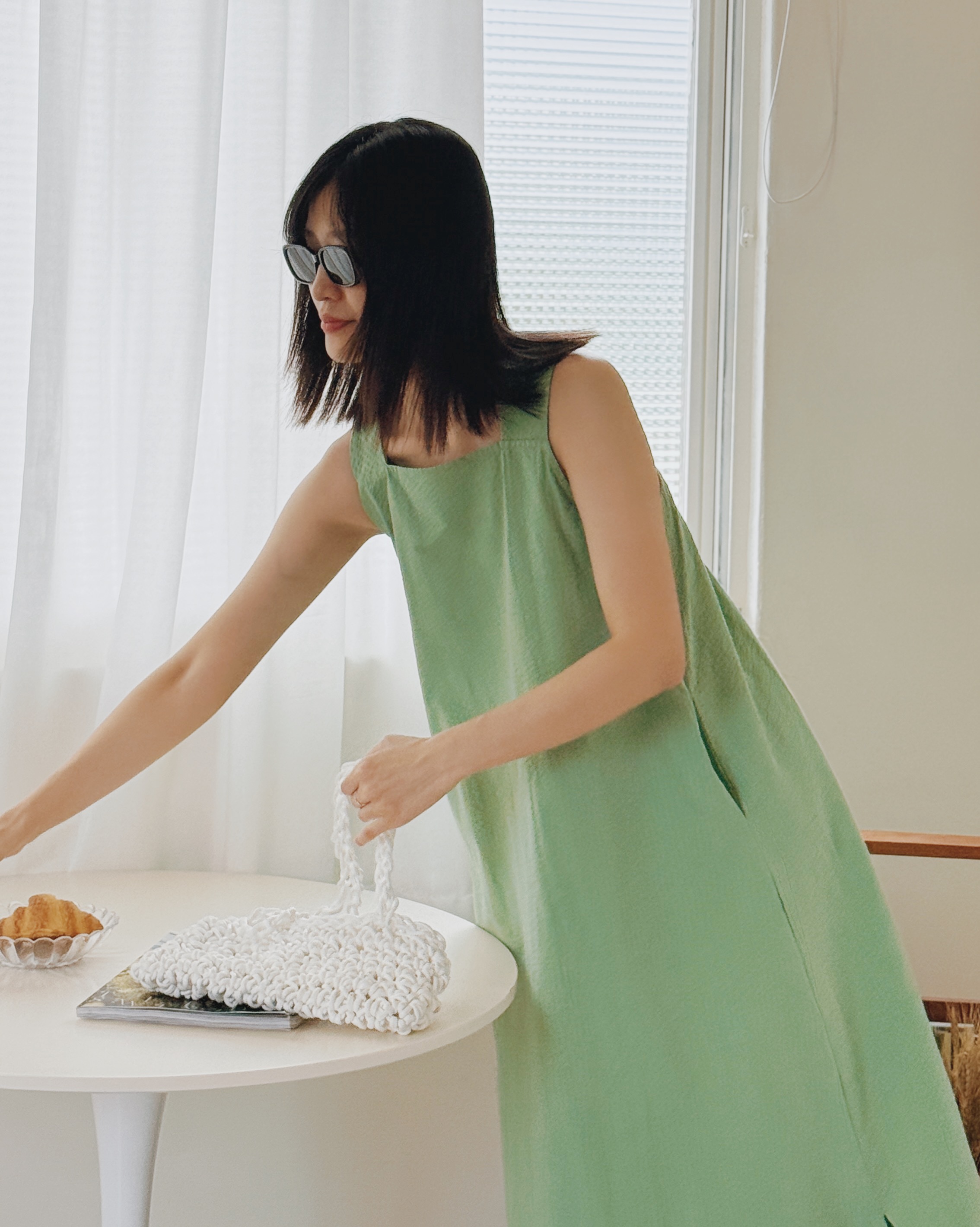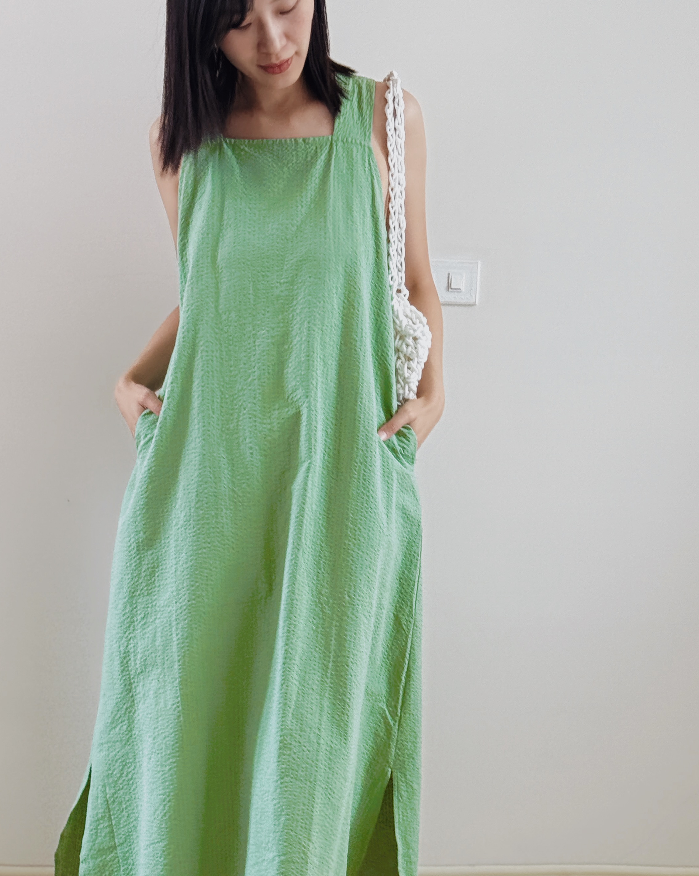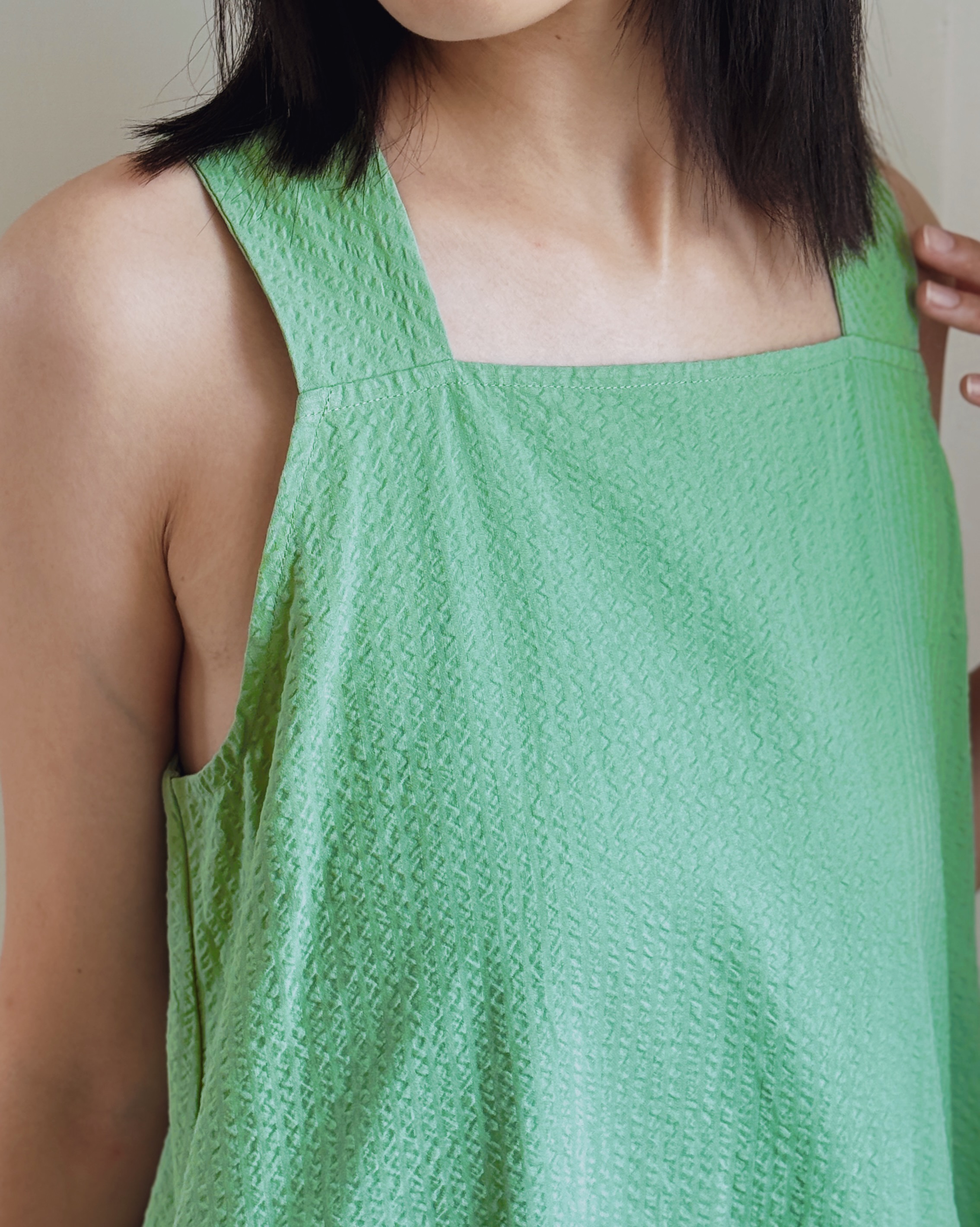 方領剪裁設計洋裝-綠
