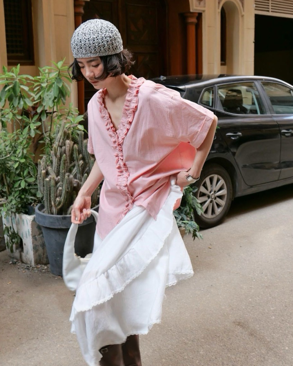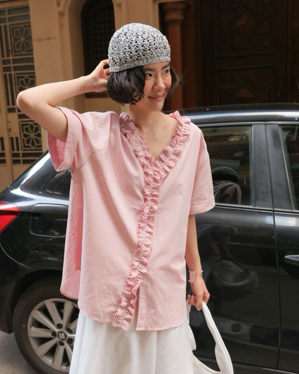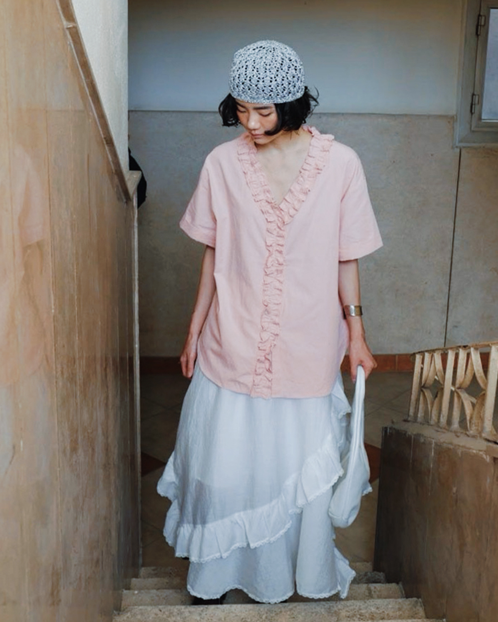 荷邊褶飾V領上衣