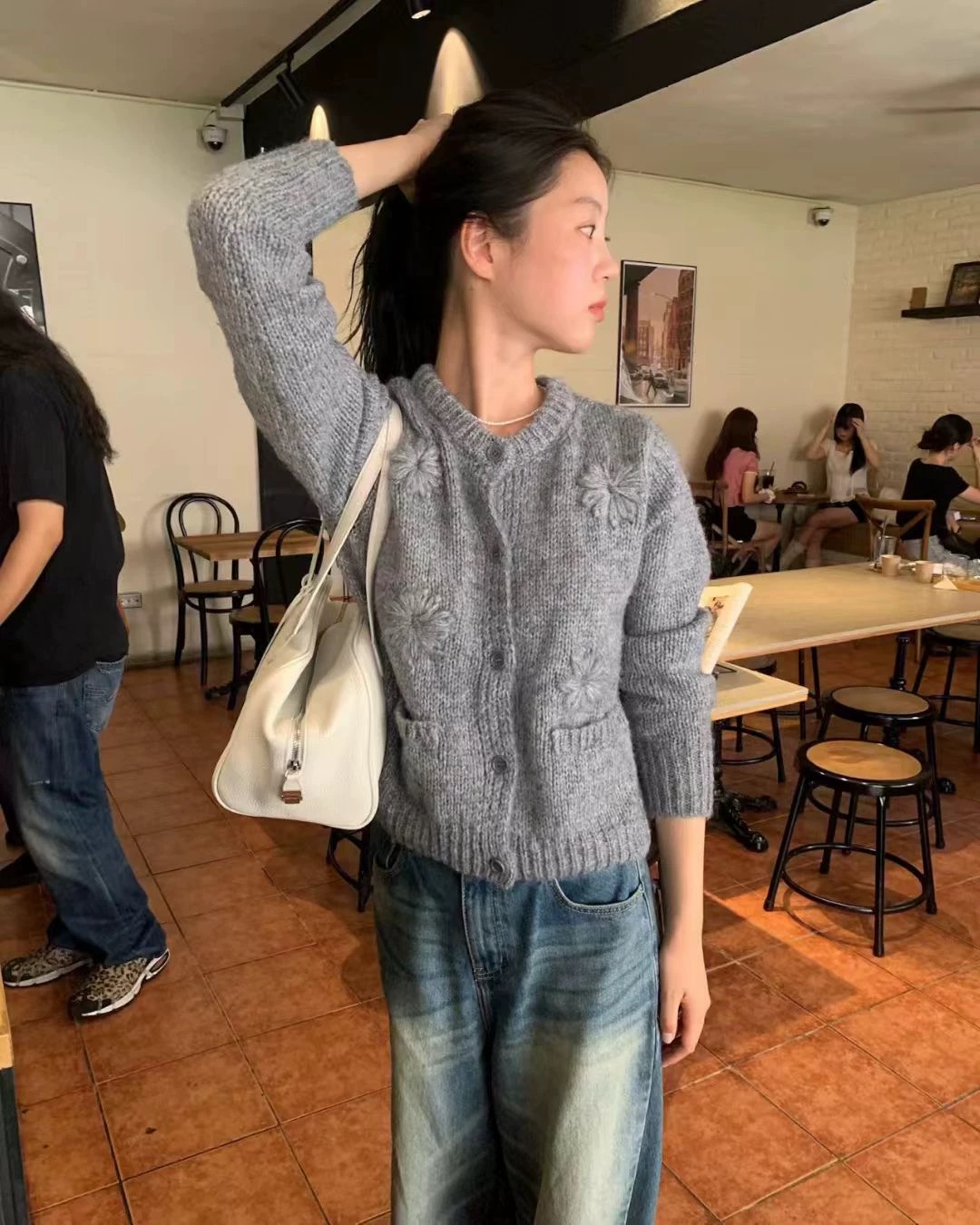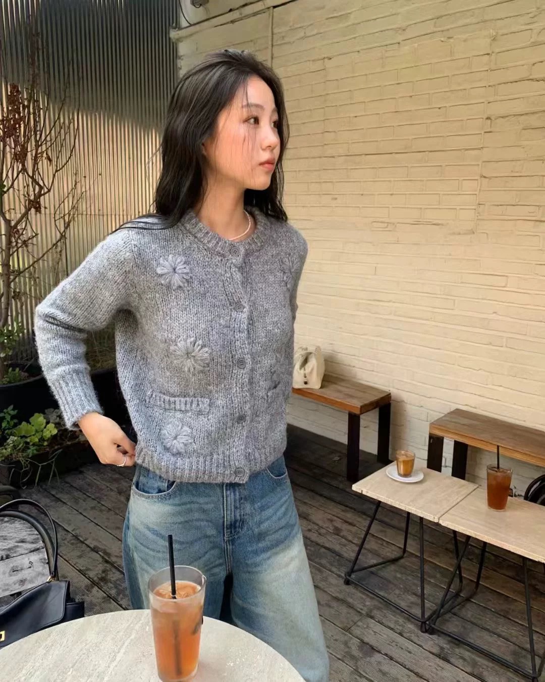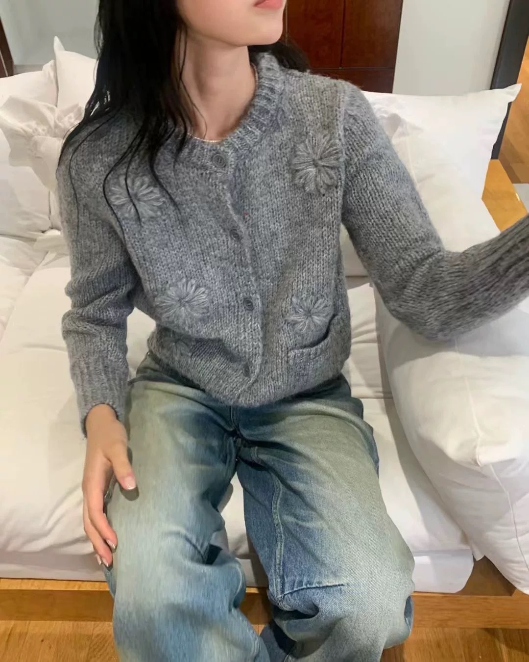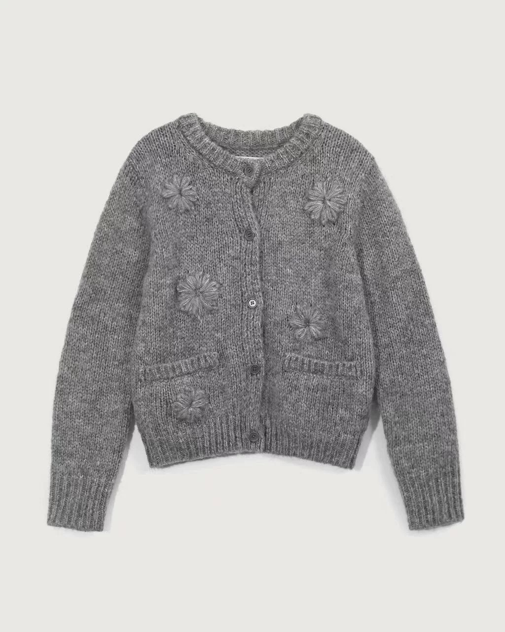 手工繡花開襟外套-灰