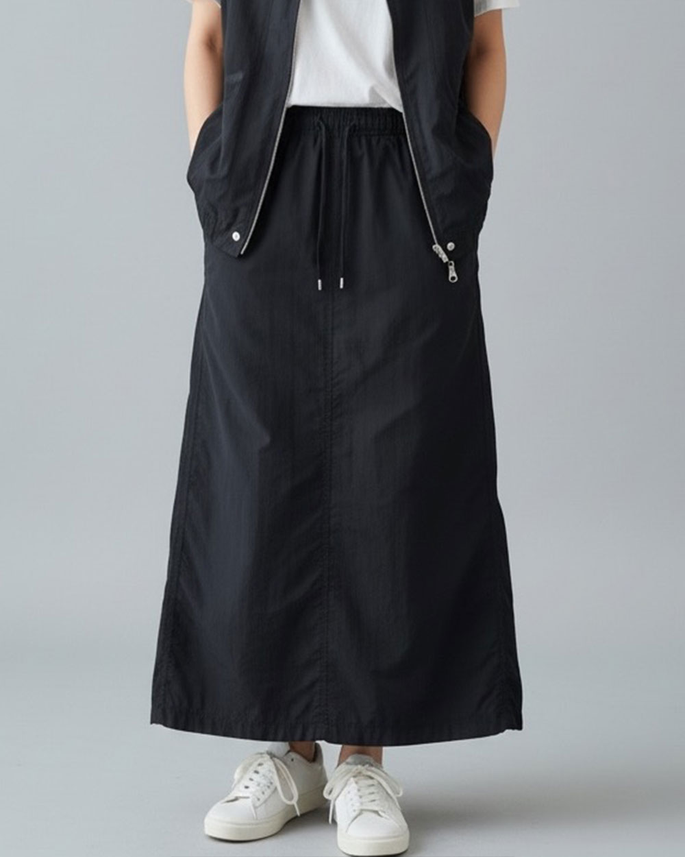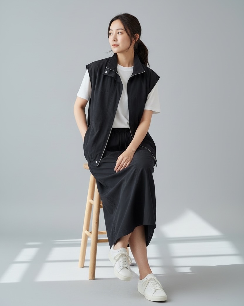 質感與實穿兼具的必備神裙!100%尼龍打造防潑水挺括面料,全鬆緊腰頭搭配抽繩,舒適不勒身。大口袋設計實用又有型,經典黑色百搭無敵。無論通勤或戶外活動,都能輕鬆穿出俐落的機能時尚感!