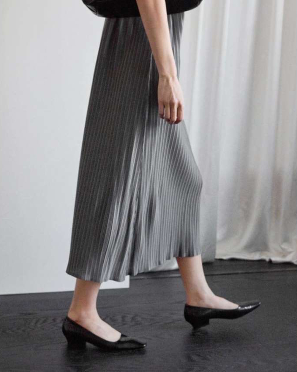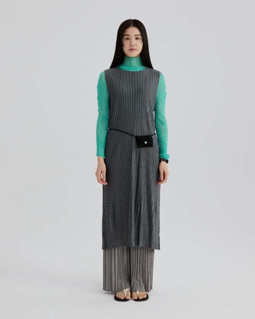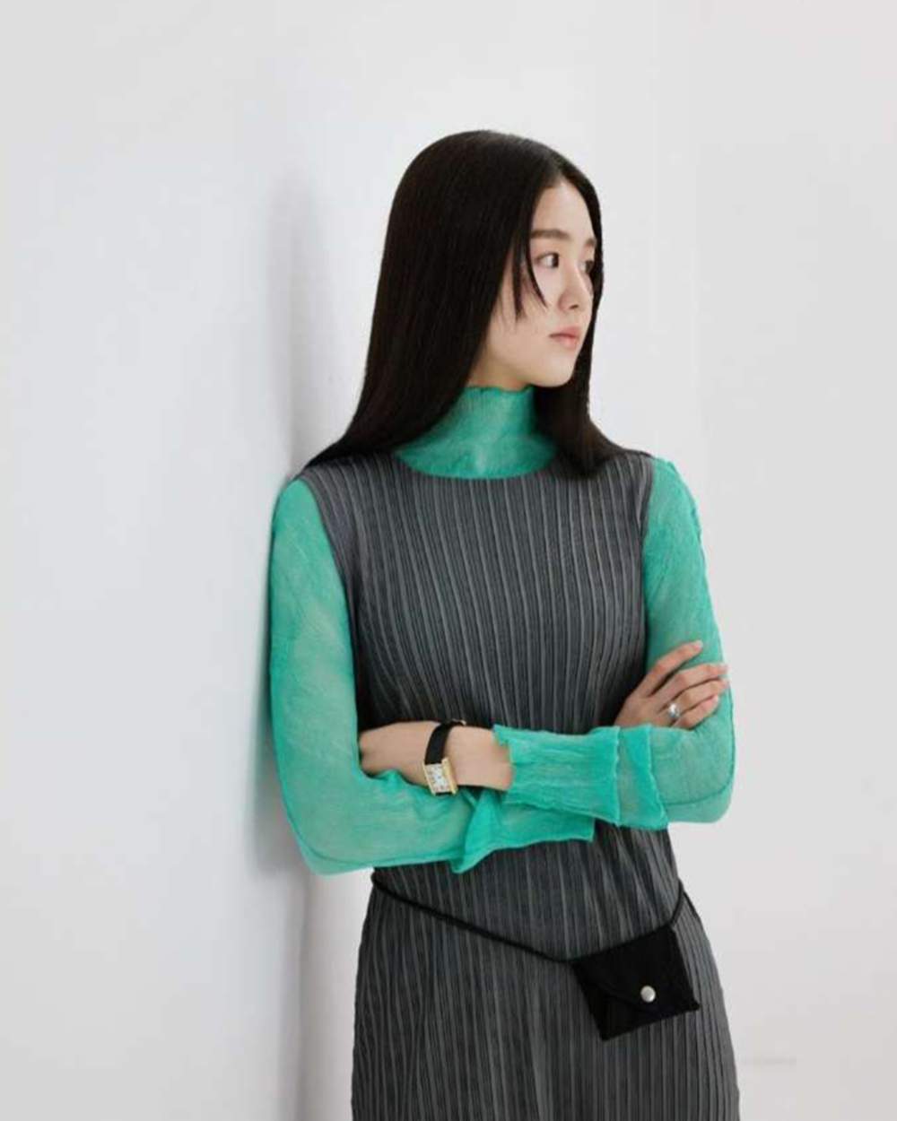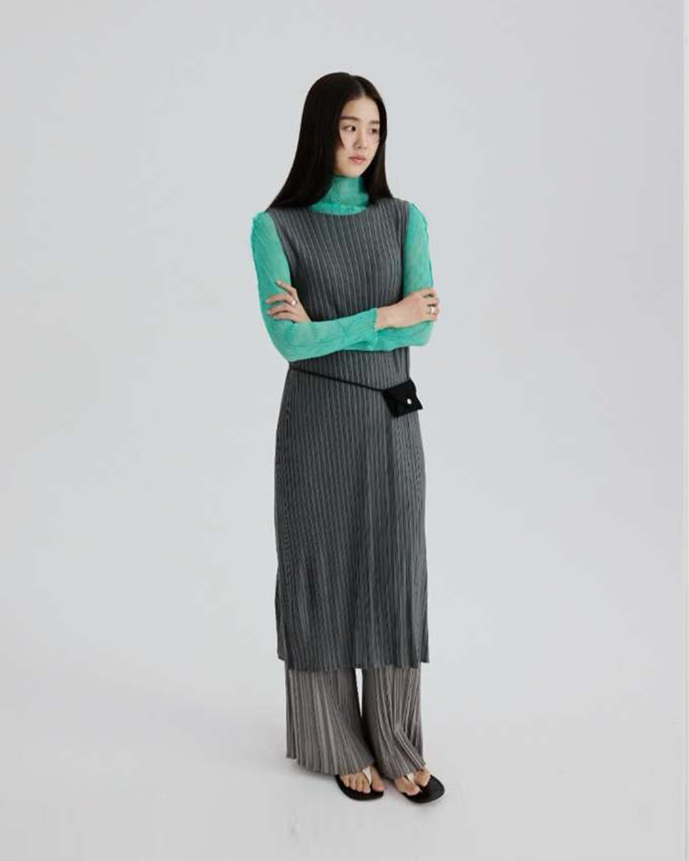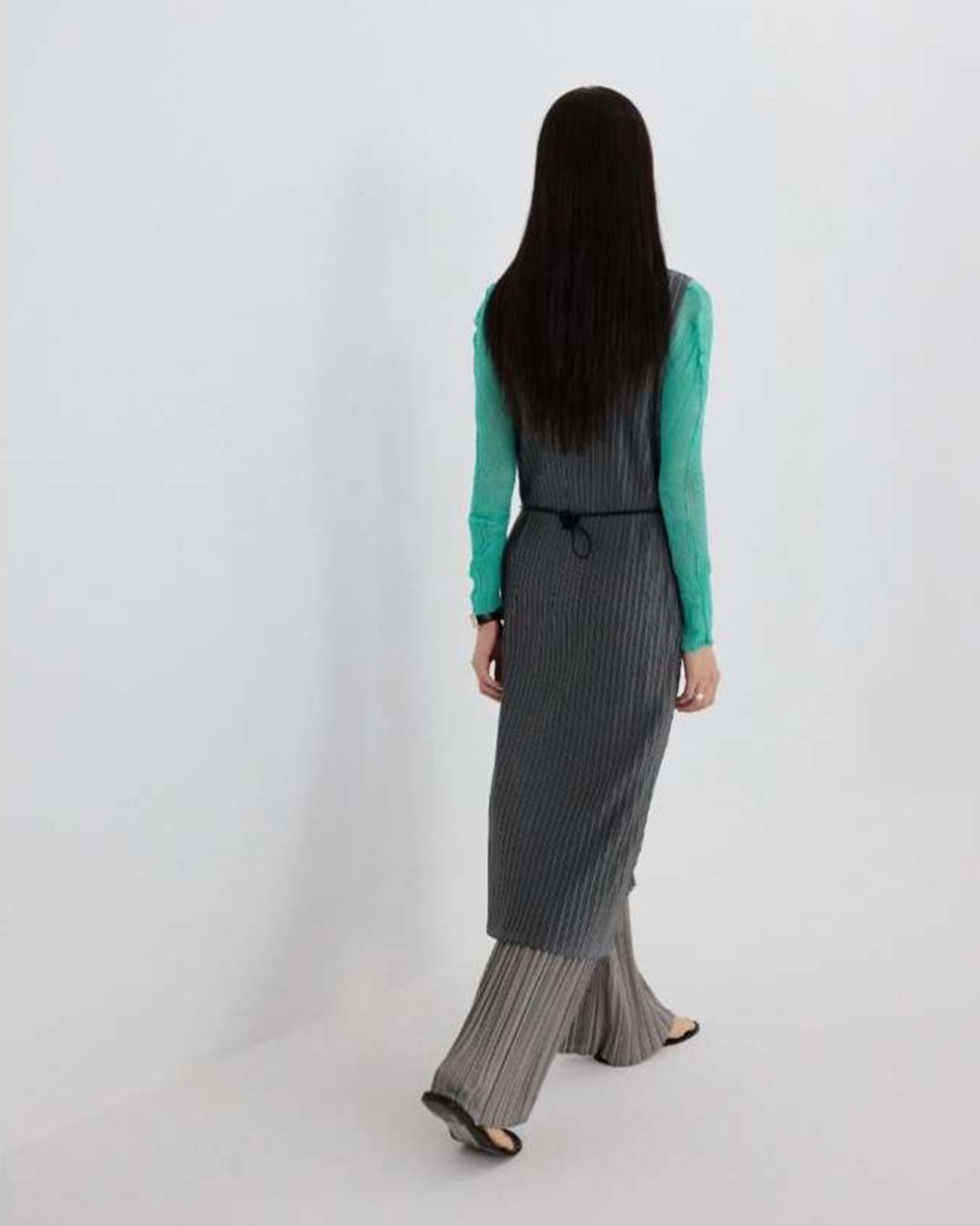 •直向壓摺工藝能極大化拉長視覺比例,穿出纖細修長的 column (圓柱) 廓形